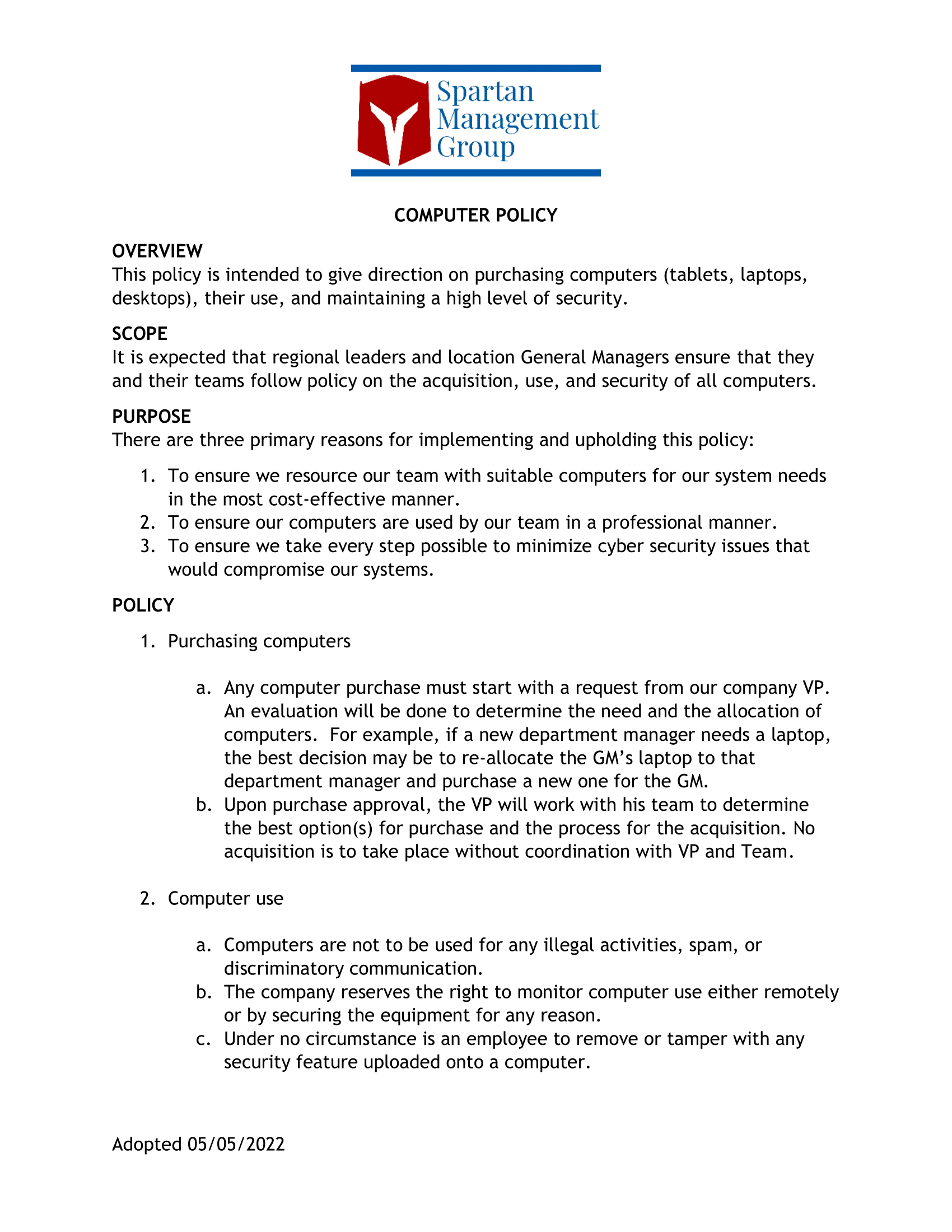 It is expected that regional leaders and location General Managers ensure that they and their teams follow policy on the acquisition, use, and security of all computers.