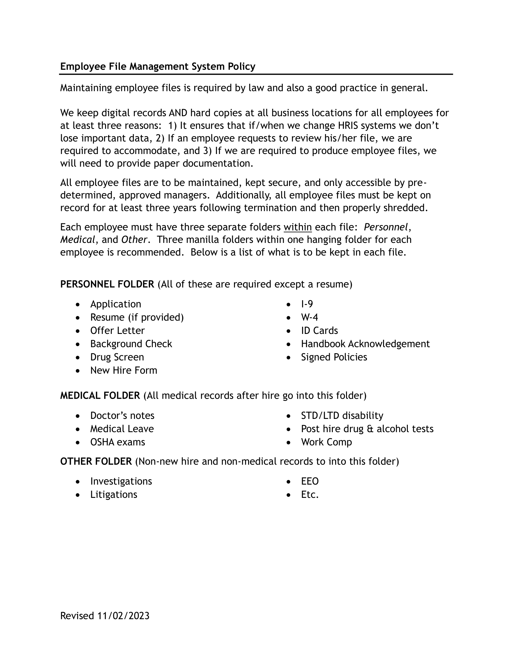 Each employee must have three separate folders within each file: Personnel, Medical, and Other. Three manilla folders within one hanging folder for each employee is recommended. Below is a list of what is to be kept in each file.