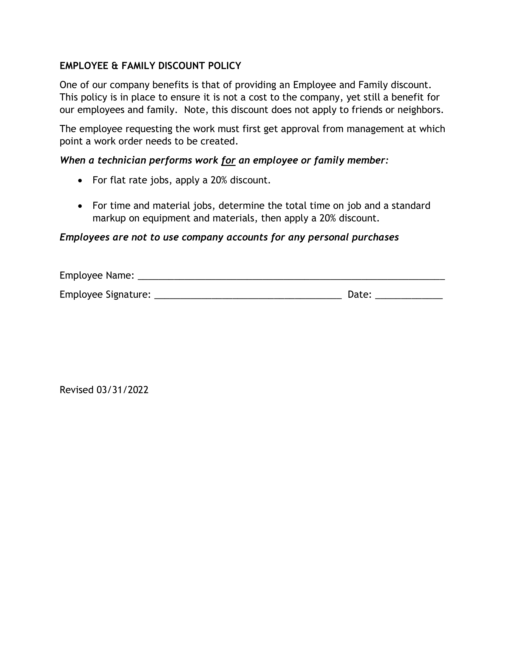 One of our company benefits is that of providing an Employee and Family discount. This policy is in place to ensure it is not a cost to the company, yet still a benefit for our employees and family. Note, this discount does not apply to friends or neighbors.