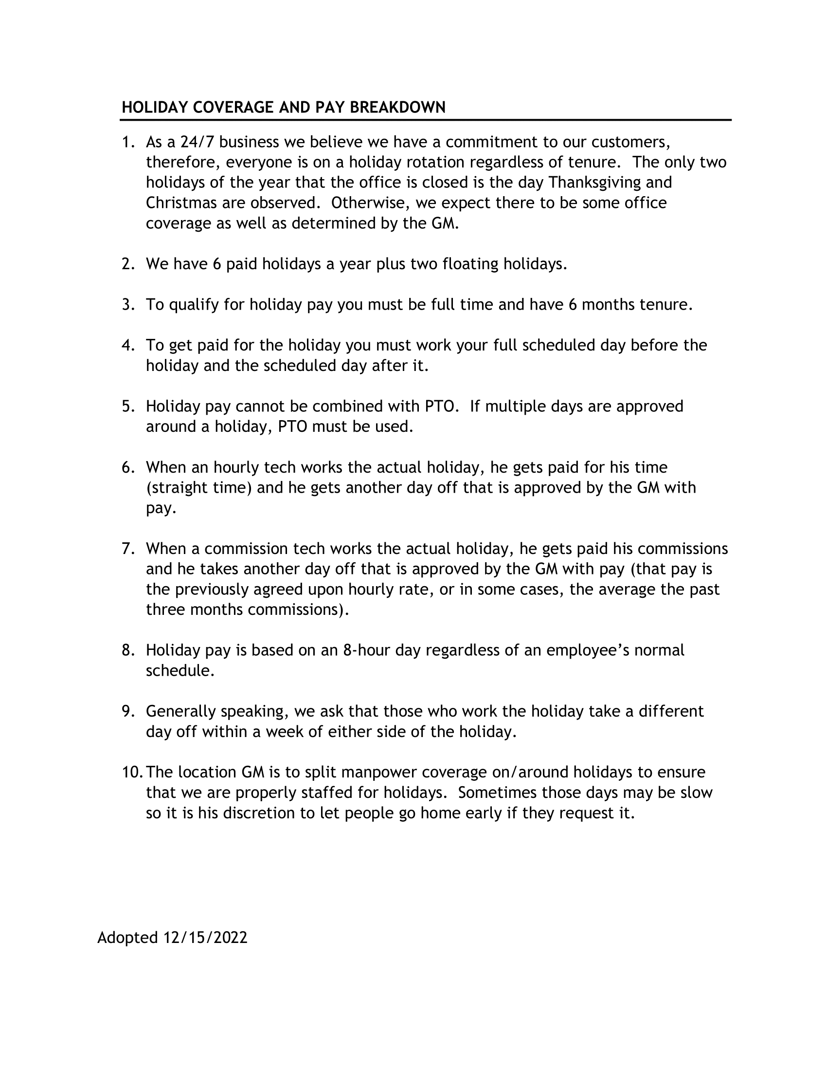 As a 24/7 business we believe we have a commitment to our customers, therefore, everyone is on a holiday rotation regardless of tenure. The only two holidays of the year that the office is closed is the day Thanksgiving and Christmas are observed. Otherwise, we expect there to be some office coverage as well as determined by the GM.
