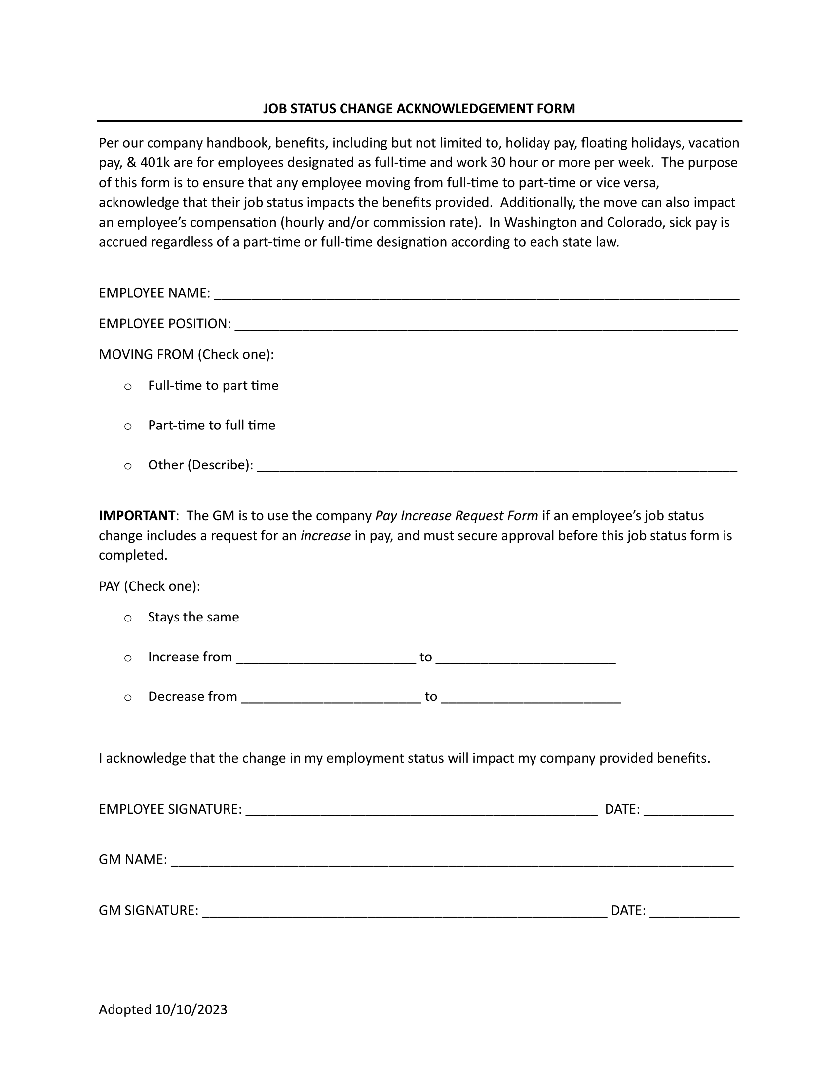 Per our company handbook, benefits, including but not limited to, holiday pay, floating holidays, vacation pay & 401k are for employees designated as full-time and work 30 hours or more per week. The purpose of this form is to ensure that any employee moving from full-time to part-time or vice versa, acknowledge they their job status impacts the benefits provided. Additionally, the move can also impact an employee’s compensation (hourly and/or commission rate).
