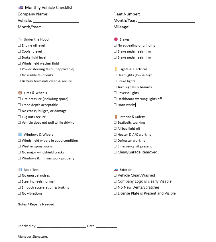 All company vehicles are expected to be inspected monthly, with any issues documented and escalated for repair. Completion of this checklist helps reduce downtime, support preventative maintenance, and ensure every vehicle on the road reflects company safety and professionalism standards.
