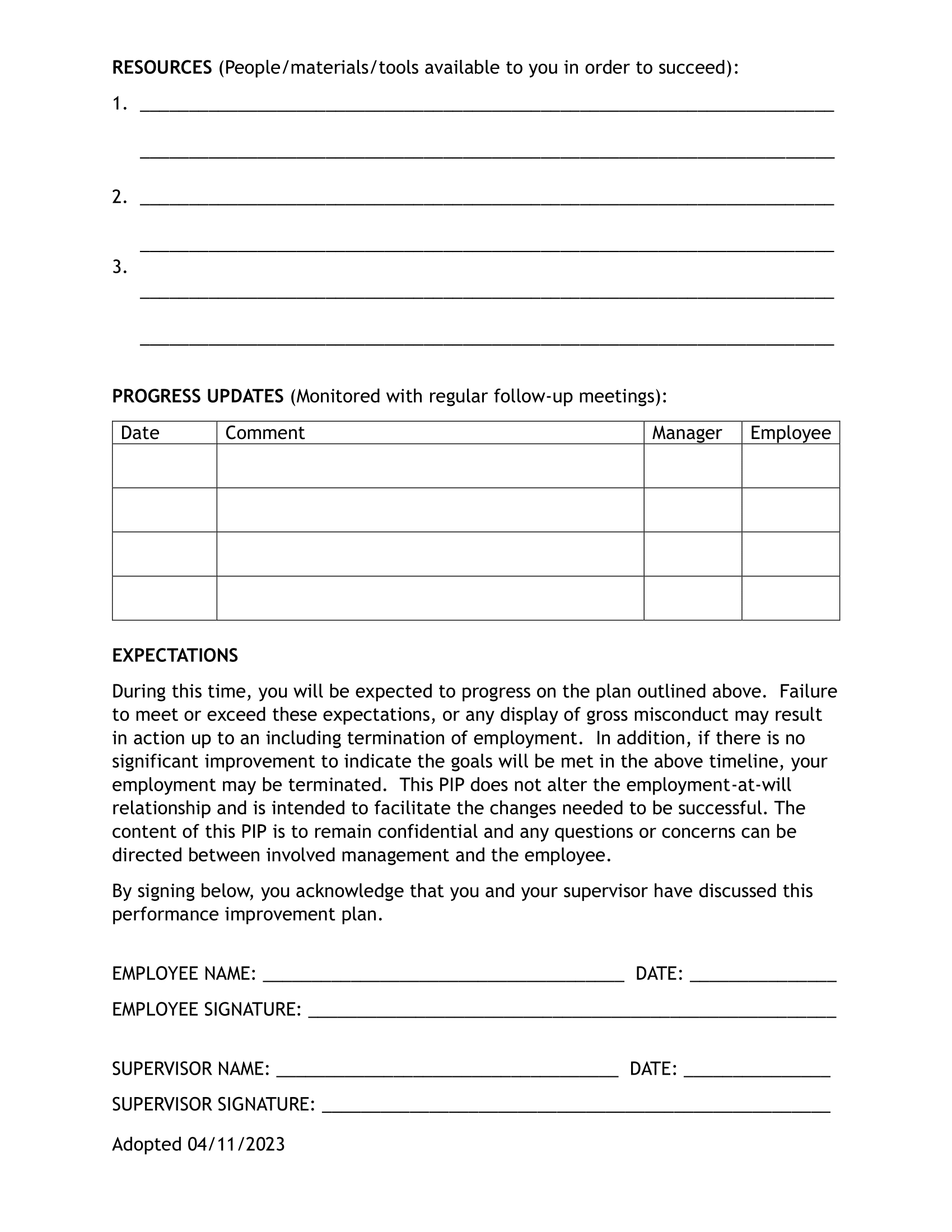 The purpose of this PIP is to define performance deficiencies, clarify performance expectations, and allow you the opportunity to demonstrate your ability to meet those expectations. This plan can be modified as necessary depending on progress. Additional pages can be attached as needed.