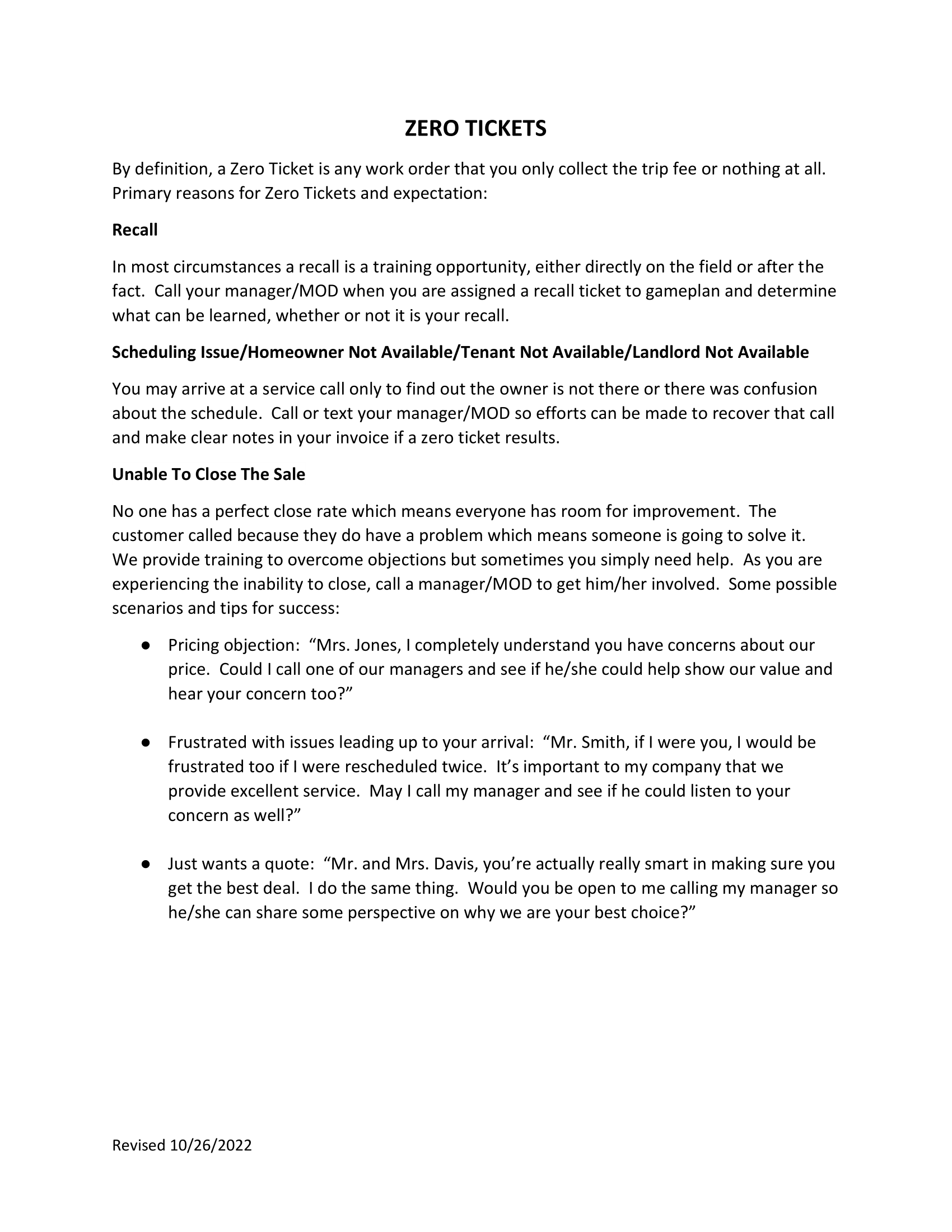 By definition, a Zero Ticket is any work order that you only collect the trip fee or nothing at all. Primary reasons for Zero Tickets and expectation:
